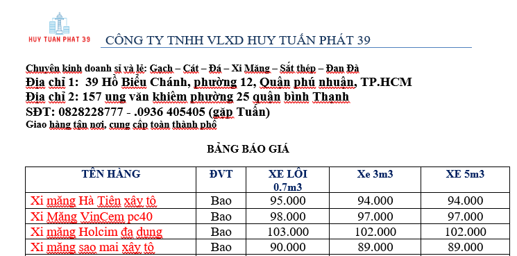 Bảng giá xi măng tháng 5/2023 của công ty VLXD Huy Tuấn Phát 39 có thể thay đổi theo thị trường và nguồn cung. Để biết thông tin chi tiết và báo giá xi măng, bạn nên liên hệ trực tiếp với công ty để được tư vấn và cung cấp thông tin mới nhất.